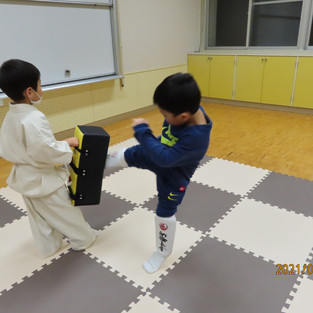 七飯町空手道場、新極真会七飯鶴野道場です。ハルヒくん空手着、乾かないと言うことで運動着で稽古です。カッコイイ運動着ですね。さて、今日のメニューは基本、型、縄跳び、壁蹴り、キックミットです。壁蹴りでは軸足の返しを重点に行い、キックミットで実践です。昨日より上手です。感じ掴んだでしょうか? 豆拳士頑張ってます。